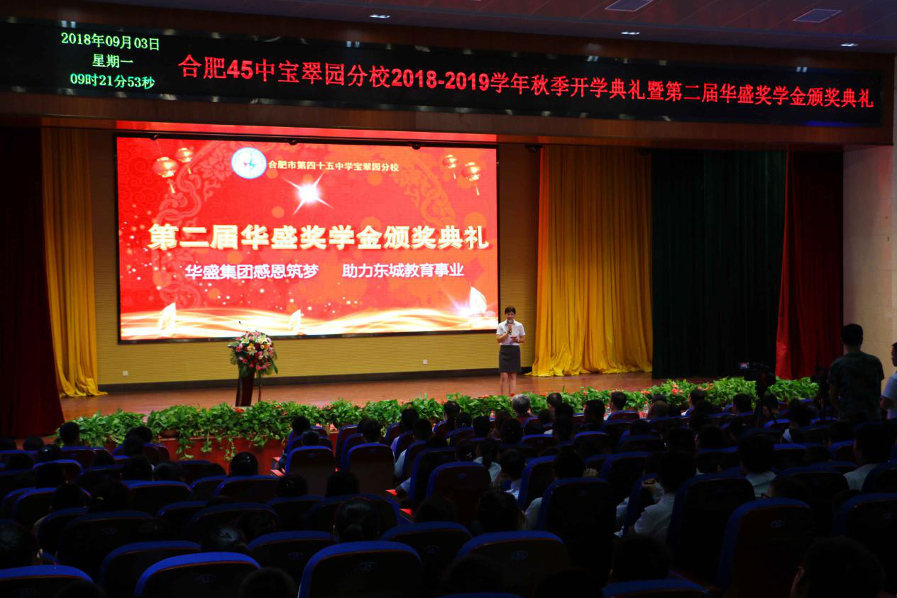 金秋送爽,硕果飘香,又是一年开学季。2018年9月3日早上9:00,合肥市第四十五中学宝翠园分校2018——2019学期秋季开学暨华盛奖学金颁奖典礼隆重举行。教育局相关领导、四十五中宝翠园分校领导、安徽华盛发展集团副总裁赵立春先生、李莉女士均出席了本次开学典礼,活动现场聚集了四十五中宝翠园分校全体师生及部分新生家长,气氛热烈。