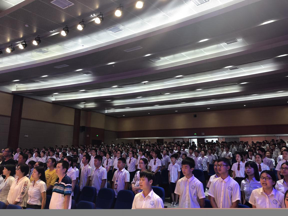 随后全体师生起立,奏国乐唱国歌,伴随着师生的嘹亮歌声礼堂内瞬间神圣而庄严,合肥市第四十五中学宝翠园分校2018-2019年度开学仪式暨华盛奖学金颁奖典礼正式拉开了帷幕。