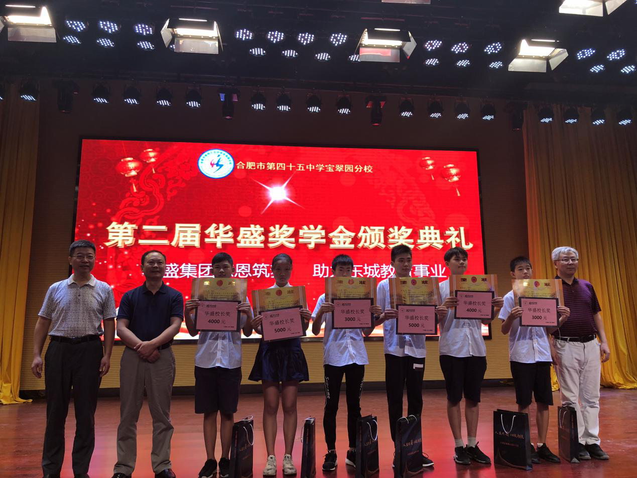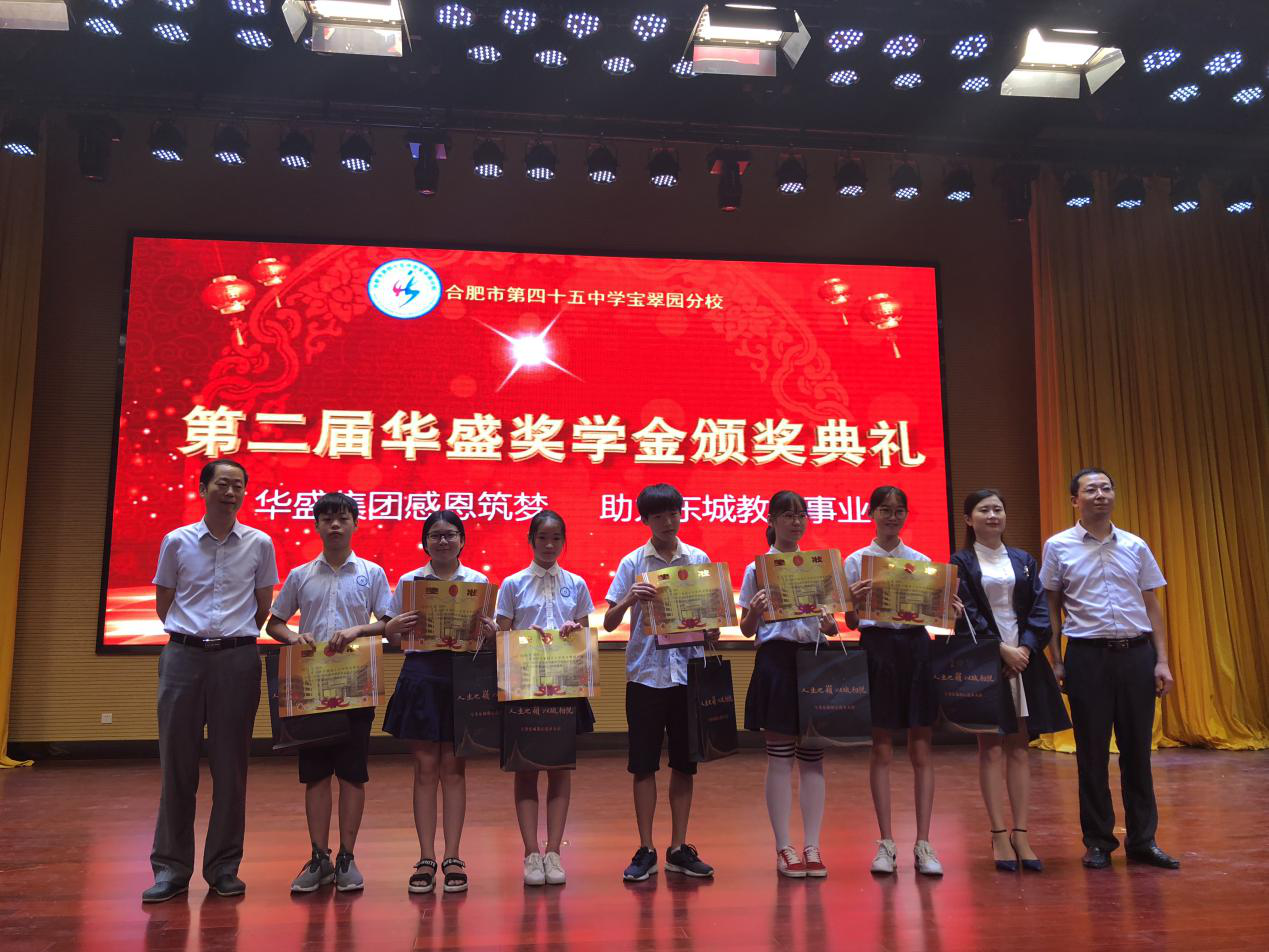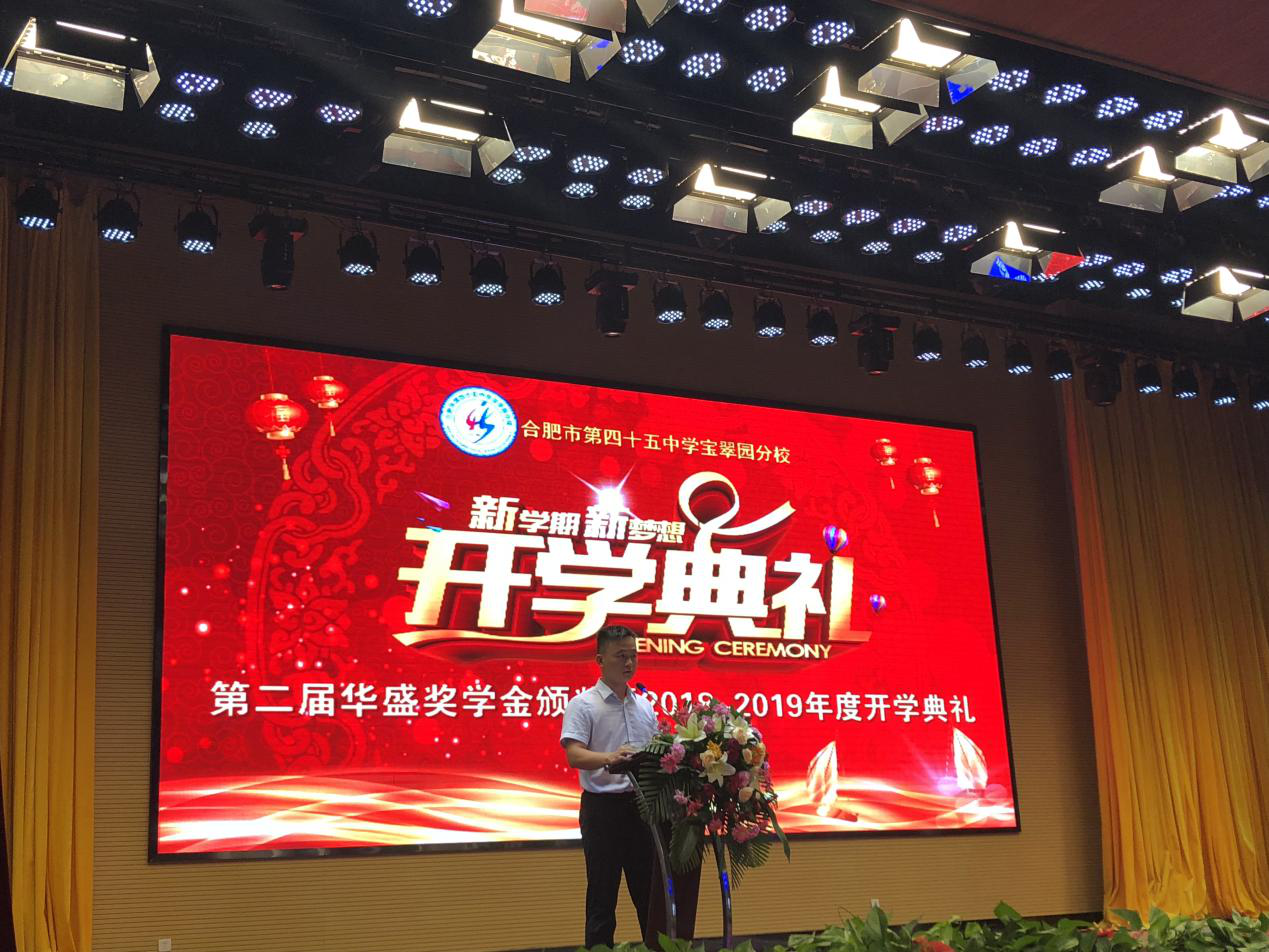 开学典礼流程过半,终于迎来了激动人心的华盛励志奖学金颁发环节,华盛奖学金是由安徽华盛发展集团设立并颁发的。21世纪初,华盛发展集团积极响应安徽省政府返乡创业的战略决策,由吉林省回归家乡, 历经十余年的高速发展,华盛集团发展成为集地产业、金融业、投资发展业于一体的大型企业集团。华盛发展集团董事长王汝仙先生一直情系桑梓,热心公益,积极捐资助学。为了给家乡的孩子提供更为优异的教育资源,把合肥市第45中学宝翠园分校做大做强,,华盛发展集团董事长王汝仙先生决定由安徽省华盛集团捐资设立合肥市第四十五中学宝翠园分校奖学基金,奖励在校就读的优秀学子。