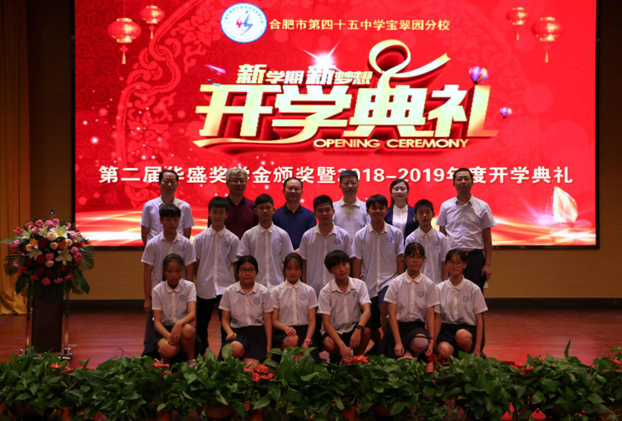 最后,在嘉宾合影留念中,合肥市第四十五中学宝翠园分校2018——2019学期秋季开学暨第二届华盛奖学金颁奖典礼也就圆满落幕了。