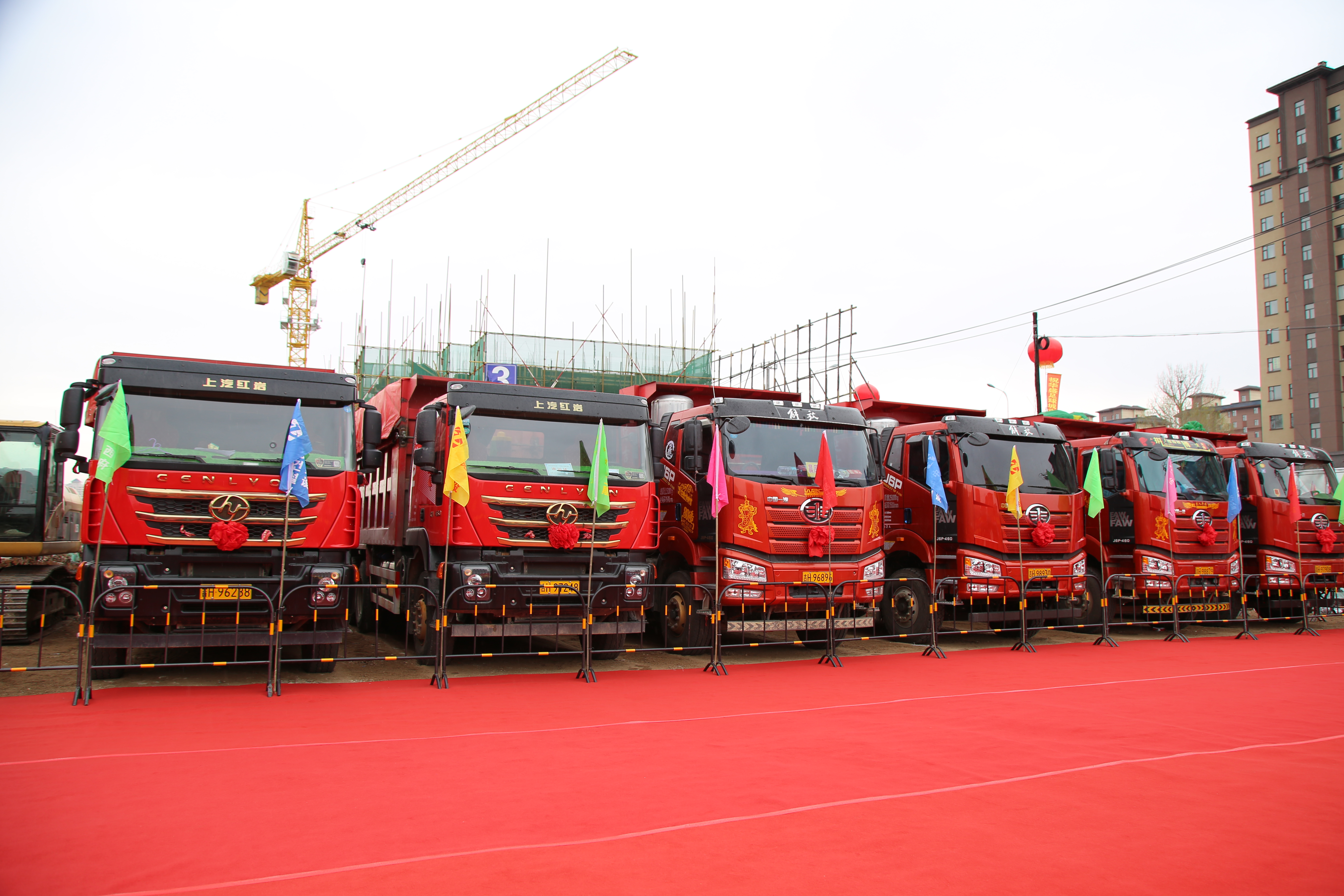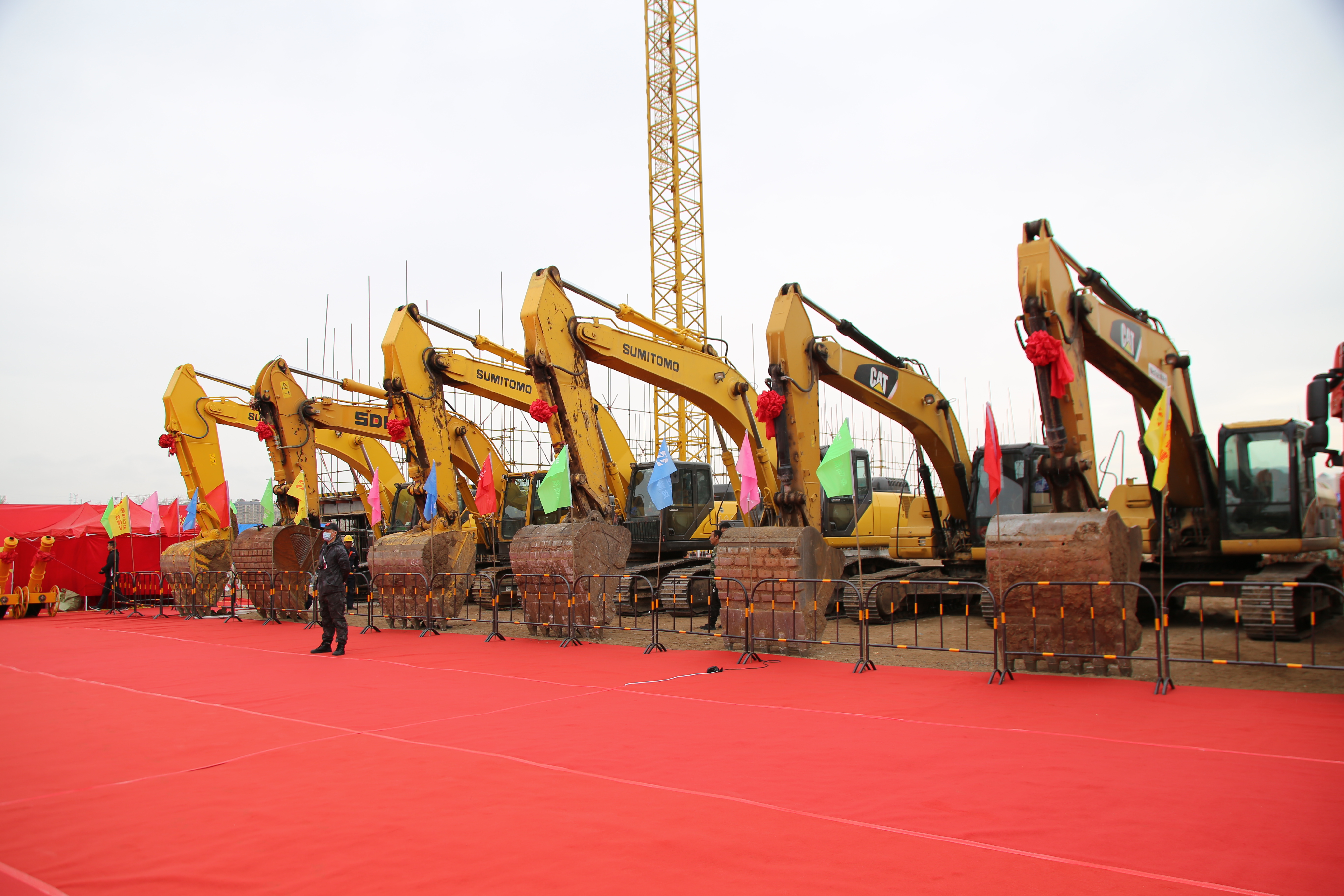 铺设一新的红毯,迎风飘扬的彩旗,高空悬挂的气球,一排排祝贺花篮,将奠基仪式现场装扮的分外喜庆。重型工程车整齐排列在旁,仪式尚未开始,现场已是高朋满座,气氛热烈欢腾。