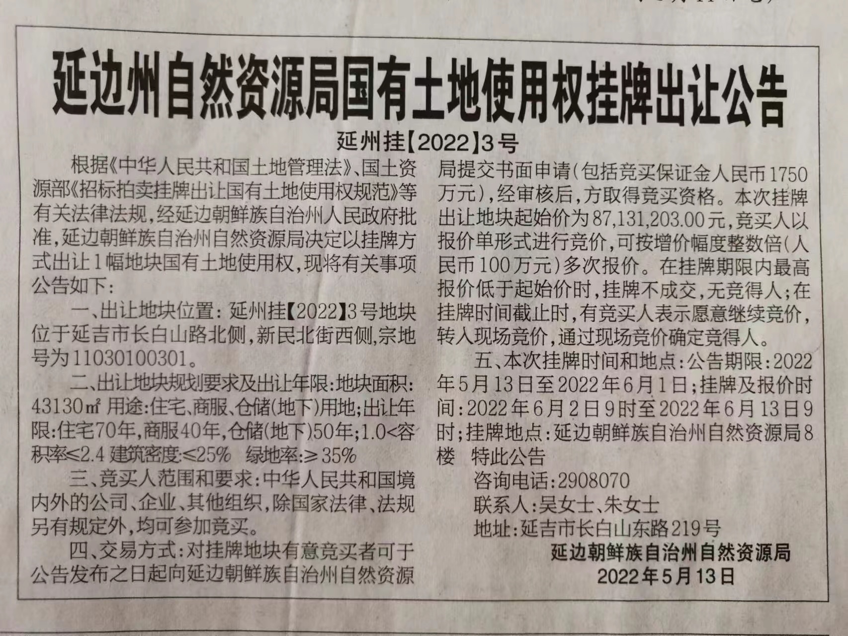 《延边州自然资源局国有土地使用权挂牌出让公告》